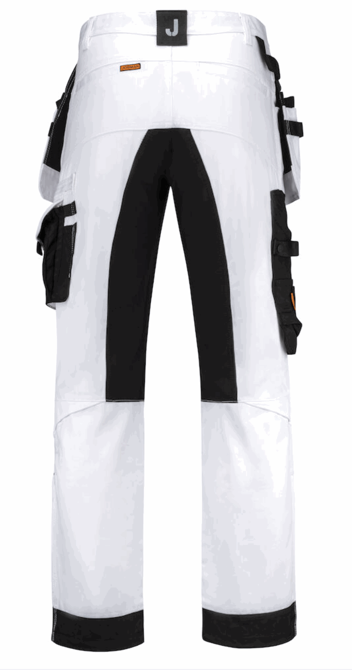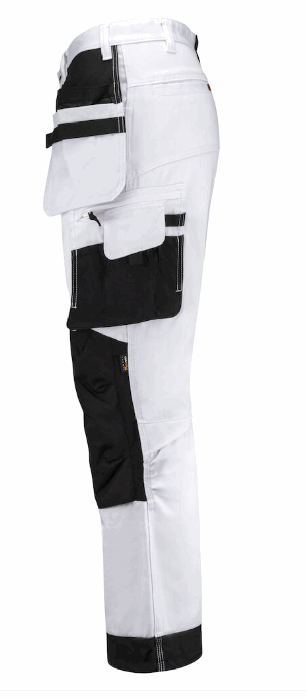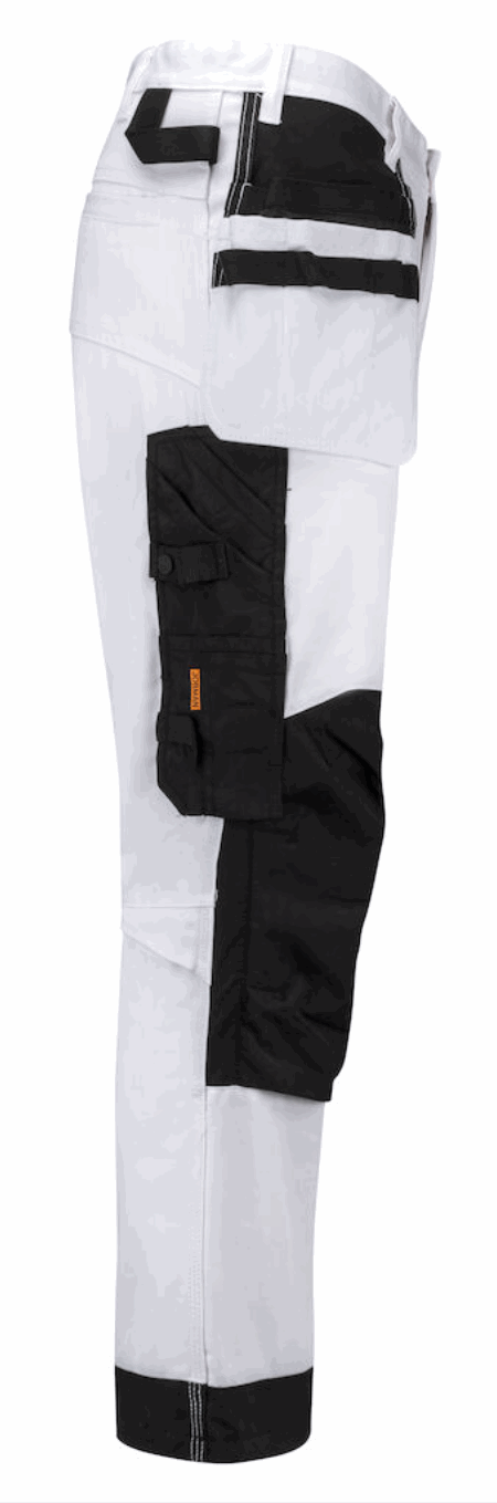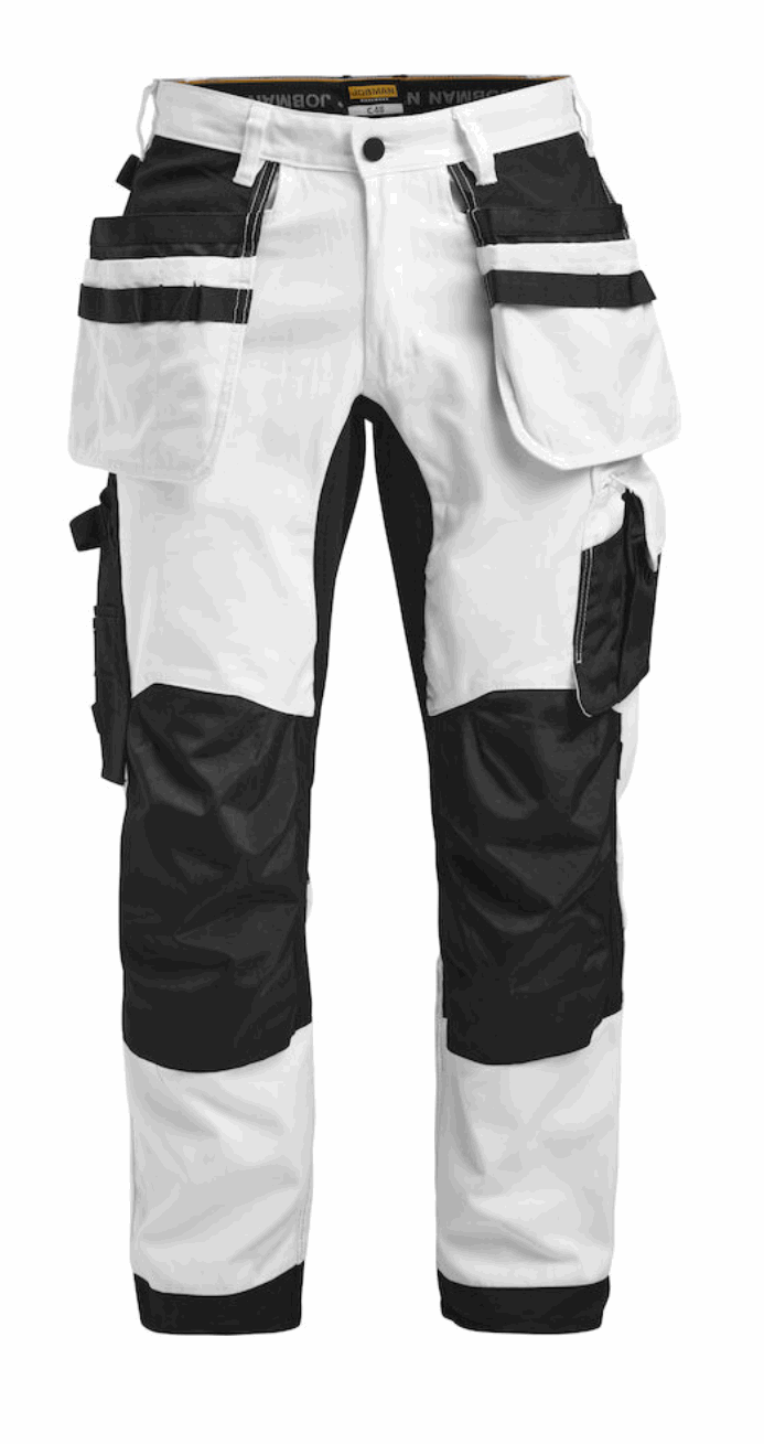 Malerbukse med stretchpaneler i form av skrittkile i stretch Cordura® som gir ekstra bevegelsesfrihet. Knebeskyttelseslommer med sider i stretch Cordura®. Core er ringspunnet bomull/polyester, en kvalitet med styrke fra polyester og komfort fra bomull. Malerbuksen har romslige hengelommer. Den indre lommen har vannavstøtende FA™-polyamidfôr på innsiden. Ekstra beltehemper på de største størrelsene. Hammerhank. Kniv- og tommestokklomme med praktiske rom for alle tenkelige maleverktøy. Skrå benlomme med glidelås, telefonrom, rom for ID-kort og ekstrarom. Snor nede på benet. Sertifisert ifølge EN 14404:2004+A1:2010 type 2, nivå 1 sammen med Jobmans knebeskytter 9943, 9944 og 9945.