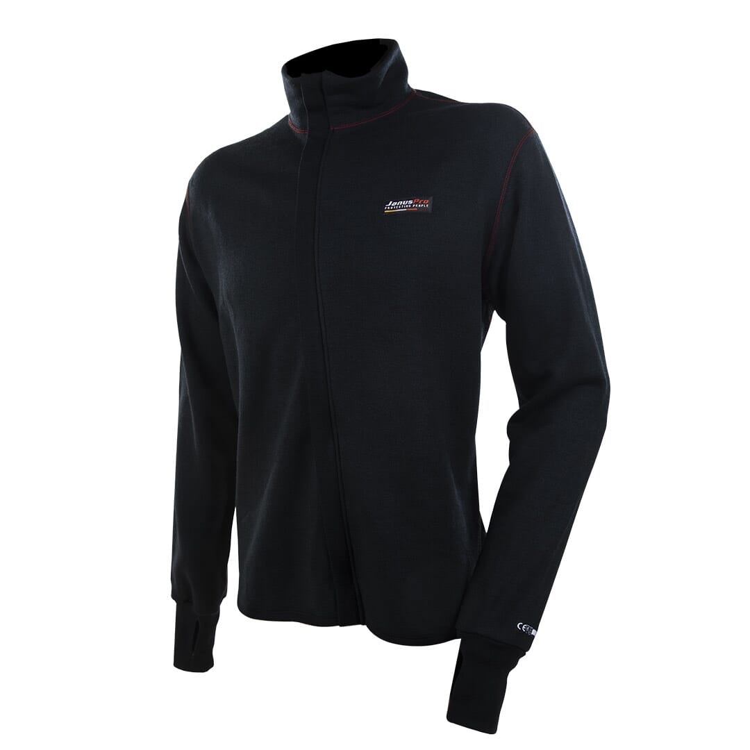 JanusPro Plus jakke i tykk ullfrotté med metallfri glidelås og tommelhullgrep. Glattstrikket utside og frotté innside med svært høy andel merinoull (79 %). Naturlig flammehemmende, antistat- og lysbue-beskyttende i hele plaggets levetid.