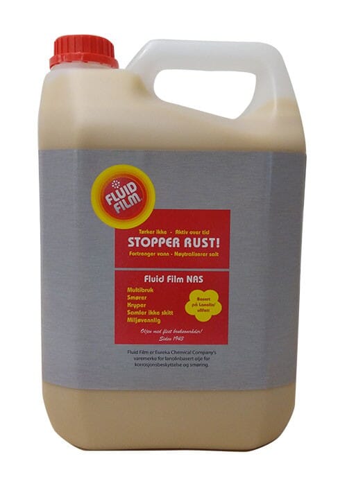Fluid Film er basert på lanolinolje (ullfett / sauefett) og har vært brukt i hele verden siden 1943 på skip og i offshoreindustren bl.a. på grunn av sine saltvannsbestandige egenskaper. På grunn av de gode rustbeskyttende og ikke minst ruststoppende egenskapene, har Fluid Film vokst seg store innenfor mange bransjer og bruksområder. Vi erfarer at den virker helt unikt til understellsbehandling, og at vanlige antirustmidler fungerer dårlig på biler som har begynt å ruste. Fluid Film NAS er svært penetrerende, fortrenger vann og samler ikke skitt slik som vanlig olje gjør. Åpne kjeder kan derfor forlenge levetiden med 300 %. Siden den ikke fordamper eller størkner, er den aktiv og penetrerende over lang tid. Den egner seg svært godt som rustløser og smøremiddel. Fluid Film er ikke konduktiv og brukes derfor på elektriske terminaler og kontakter, fordelerlokk og batteripoler. Sprøyteutstyr og sonder trenger ikke å rengjøres etter bruk siden Fluid Film ikke størkner. Fluid Film kan lett fjernes med steamer eller vanlig avfetting, f.eks. CleanAll eller white spirit. Ikke bland med andre produkter. Tynning kan gjøres med Liquid A. Fluid Film er tiksotropisk, det vil si at den blir tynnere ved omrøring på samme måte som kvikksand. I lukket emballasje kan middelet lagres over ubegrenset tid. Andre bruksområder: våpen, fiskesneller, bolter, låser, låsesylindre, hengsler, avtagbare kroker, lastavhengige ventiler, wirer, stålkontruksjoner, maskindeler, anleggsmaskiner, gressklipperpanner, hagesaks, vinterkonservering, snøfresere, korrosjonsbeskyttelse på fly og helikoptere, impregnering av lær, polering av aluminium, rustfritt stål, krom og alle andre metaller, polering av verktøy, treverk, lakk og plast. Fluid Film er løsemiddelfri og har under 1 % VOC. Den er ikke giftig eller farlig og har flammepunkt på 207 ºC Fluid Film svir ikke gress og vegetasjon og egner seg godt til landbruksmaskiner. Spray på en blomst og den dør ikke før den skal.