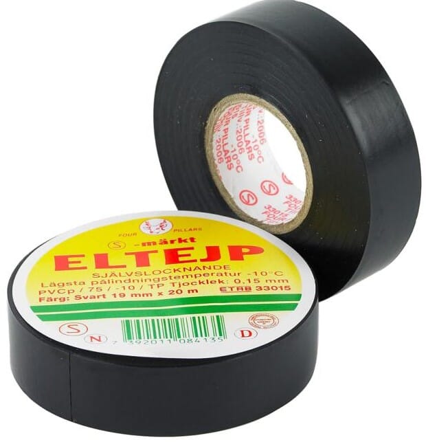 Sort elektrotape laget av myk PVC. Brukes ved elektriske installasjoner.