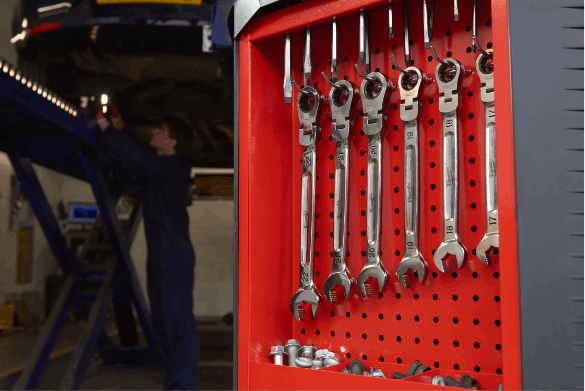 Brett med kroker og verktøyholdere for enkel tilgang til de mest brukte verktøyene.