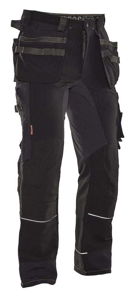 Smidig 4-veis stretch i slitesterkt ripstop-materiale. Romslige hengelommer med ekstra rom og forsterket innside; kan puttes i frontlommene. Silikonbånd i bukselinningen holder buksen på plass. Forsterket stretch Cordura® i skrittet. Delvis fritthengende baklommer gjør at det lettere å få tak i innholdet. Ekstra beltehemper på de største størrelsene. Hammerhank. Tommestokklomme med knivholder. Benlomme med skjult glidelås, ID-kortholder og mobiltelefonlomme. Forbøyde knær med knebeskyttelseslommer i stretch Cordura® med 3Ms refleksbiser og to høyder. Mesh i knefolden for ventilasjon. Forsterket benkant i polyamid som ikke absorberer fukt. Refleksbise og innstramming nede på benet. Sertifisert ifølge EN 14404:2004+A1:2010 type 2, nivå 1 sammen med Jobmans knebeskytter 9943, 9944 og 9945.
