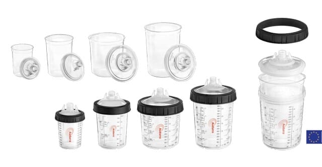 Audurra Smart Cup System består av lokk- og innerbeger-sett, samt separate ytterkopper og låseringer. Hvert lokk har et permanent integrert filter som sørger for optimal filtrering av malingen under bruk. Du kan velge mellom lokk med 125 μ filter – ofte anbefalt for vannbasert maling – eller 200 μ filter for tradisjonell løsemiddelbasert maling.