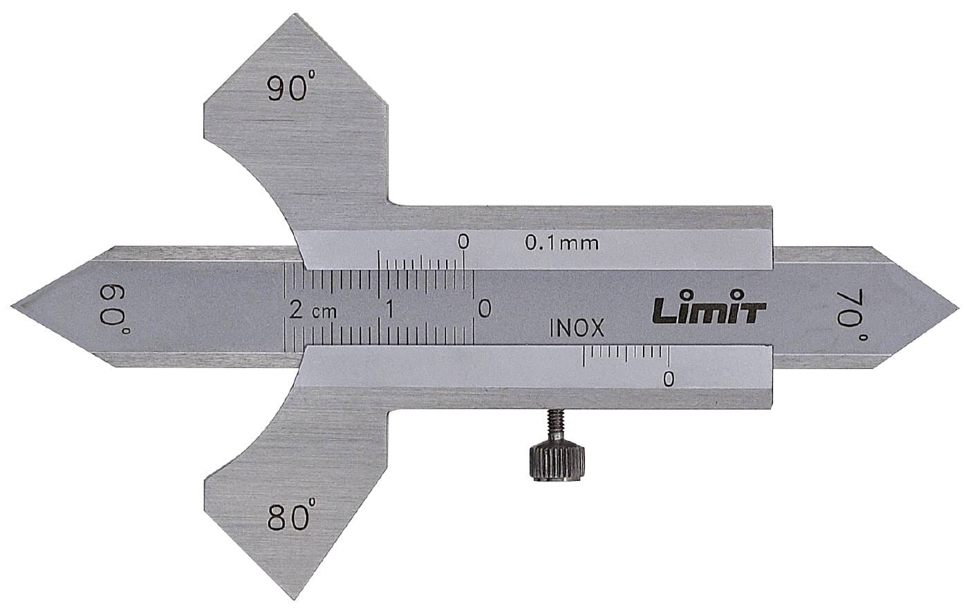 Sveisefugelære for måling av høyden på plane sveisefuger og dto i hjørner. Av stål. Gradert i mm samt med 1/10 mm nonie. Vinkelspisser 60°-70°-80°-90°.
