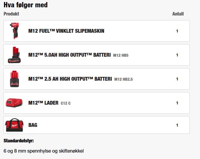 Pakken inneholder maskin, 5 ah batteri, 2,5 ah batteri, M12 lader og bag.