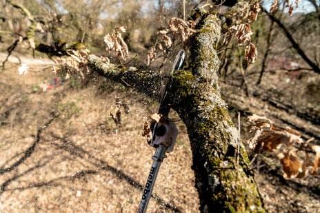 Sikker trepleie med grensag forsatsen i Metabos multifunkssystem - alt-i-ett løsningen for hagearbeid