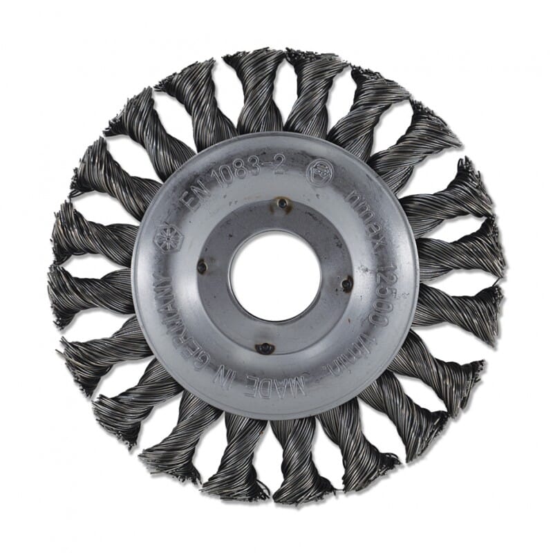 Wheel brush with knotted wires. For angle grinders.Long life.High cleaning power.Aggressive applications for removal of rust, foulings and welds.