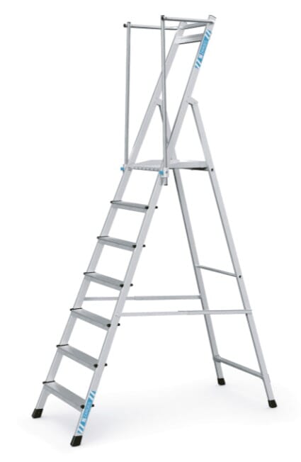En sikker og proff trappestige med lav vekt, ekstra bredde, 40x40 cm stor plattform, innfellbart rekkverk og sklisikre trinn