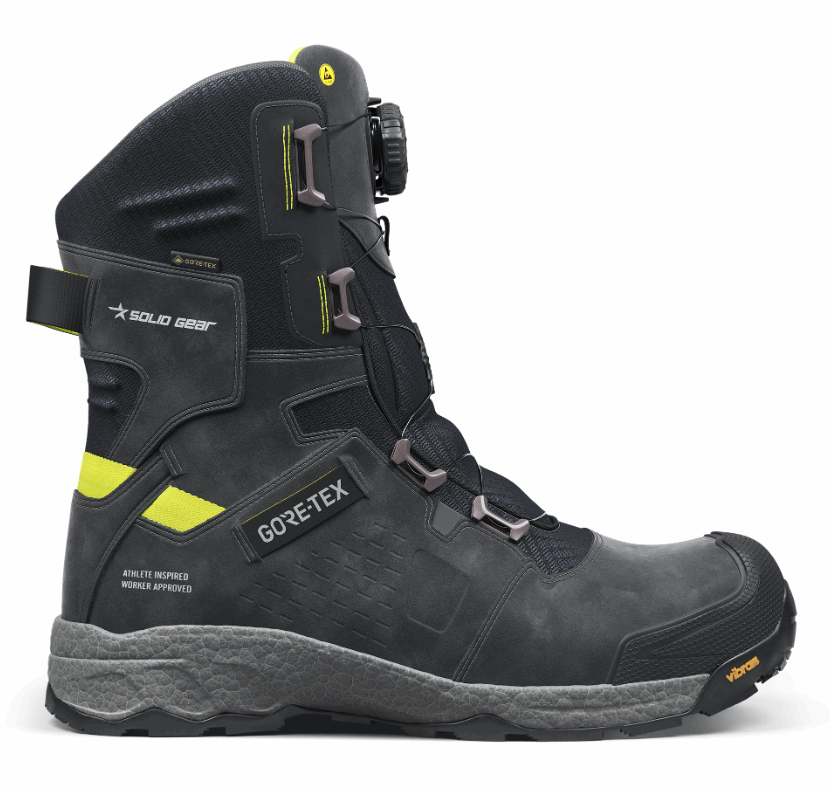 Verneskoen er utstyrt med BOA® Fit System for en optimal passform, og GORE-TEX® vinterfôr og membran for kuldeisolering som hindrer vann i å komme inn i støvelen. ETPU mellomsåle med energiretur og god demping, som både varer over tid og forblir myk i kalde temperaturer. Doble TPU-gelenker er integrert i mellomsålen for å opprettholde en unik stabilitet og vridningsstivhet. Den nyutviklede gummisålen med Traction lug-gummi fra Vibram® gir godt grep under vinterforhold, også i kalde temperaturer. Innersåle fra OrthoLite®, spesialdesignet for Solid Gear-lesten, har overlegne energireturegenskaper og er hovedsakelig laget av resirkulerte materialer. Tåhette i glassfiber og myk spikertrampbeskyttelse. ESD-funksjon i henhold til EN IEC 61340-4-3:2018. Overdel: Nubuck-skinn sertifisert av LWG og tekstil. Fôr: GORE-TEX®-ull/polyester. Membran: GORE-TEX®. Ytteråle: Olje- og varmebestandig vinteroptimalisert Vibram®-gummi med antiskli. Mellomsåle: ETPU. Innersåle: PU-skum med god pusteevne og resirkulerte materialer. Lissesystem: BOA® Fit System. Passform: Bred. Størrelser: 36–48. Sikkerhetsstandard: EN ISO 20345:2022 S7S, SR, HRO, FO, CI. Beskyttelse: Tåhette i glassfiber og myk, metallfri spikertrampbeskyttelse.